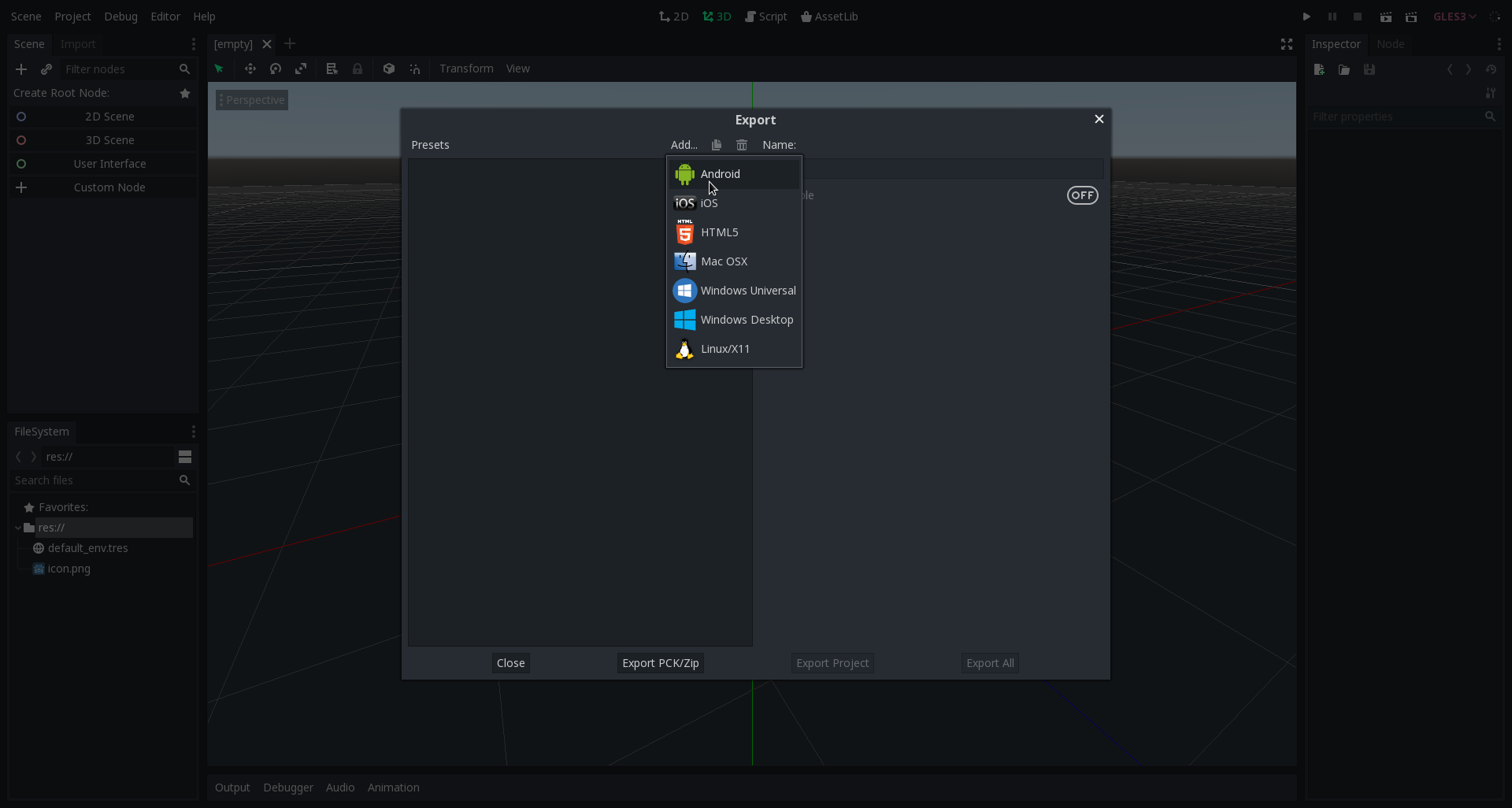 To do this, go back to the Project dropdown and this time select the Export option. This will open the Export dialog, there click Add... > Android to add the Android runnable: