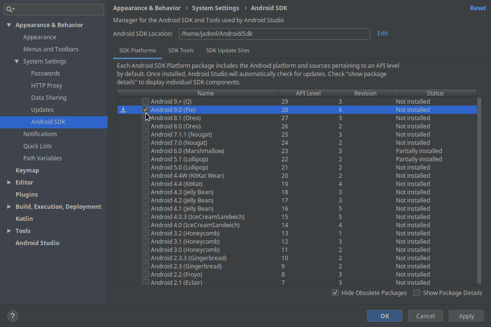 Once you have the device's Android version, go back to the SDK Manager: